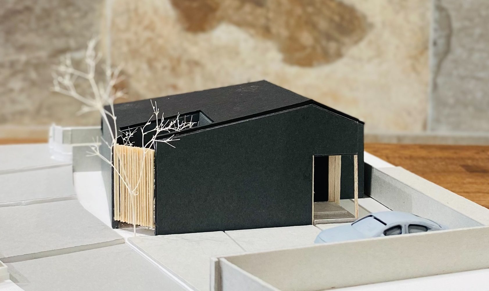 外観は落ち着いたブラック、屋根は太陽光パネル設置と採光を同時に実現する寄棟形状。